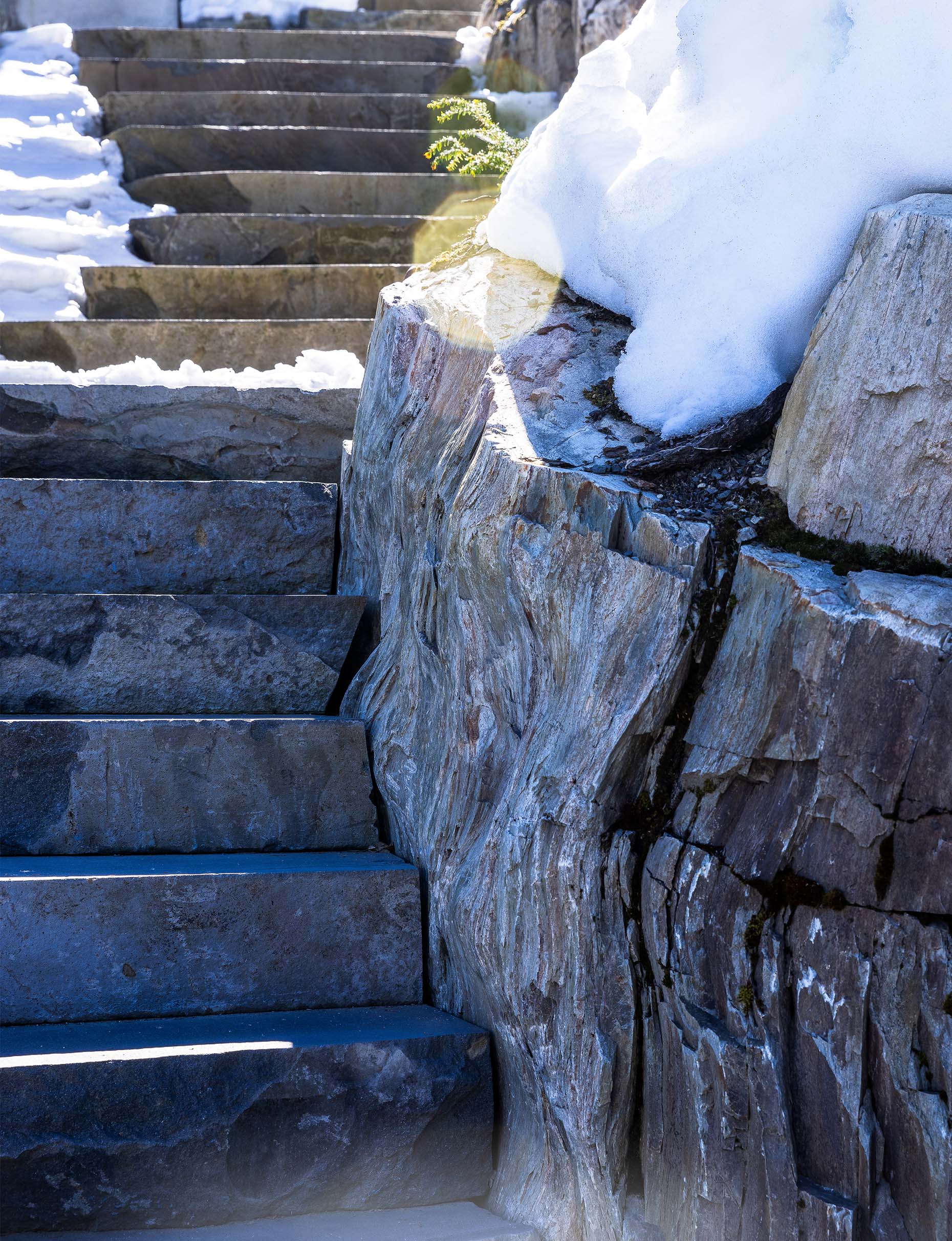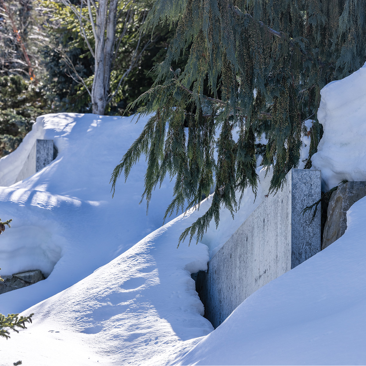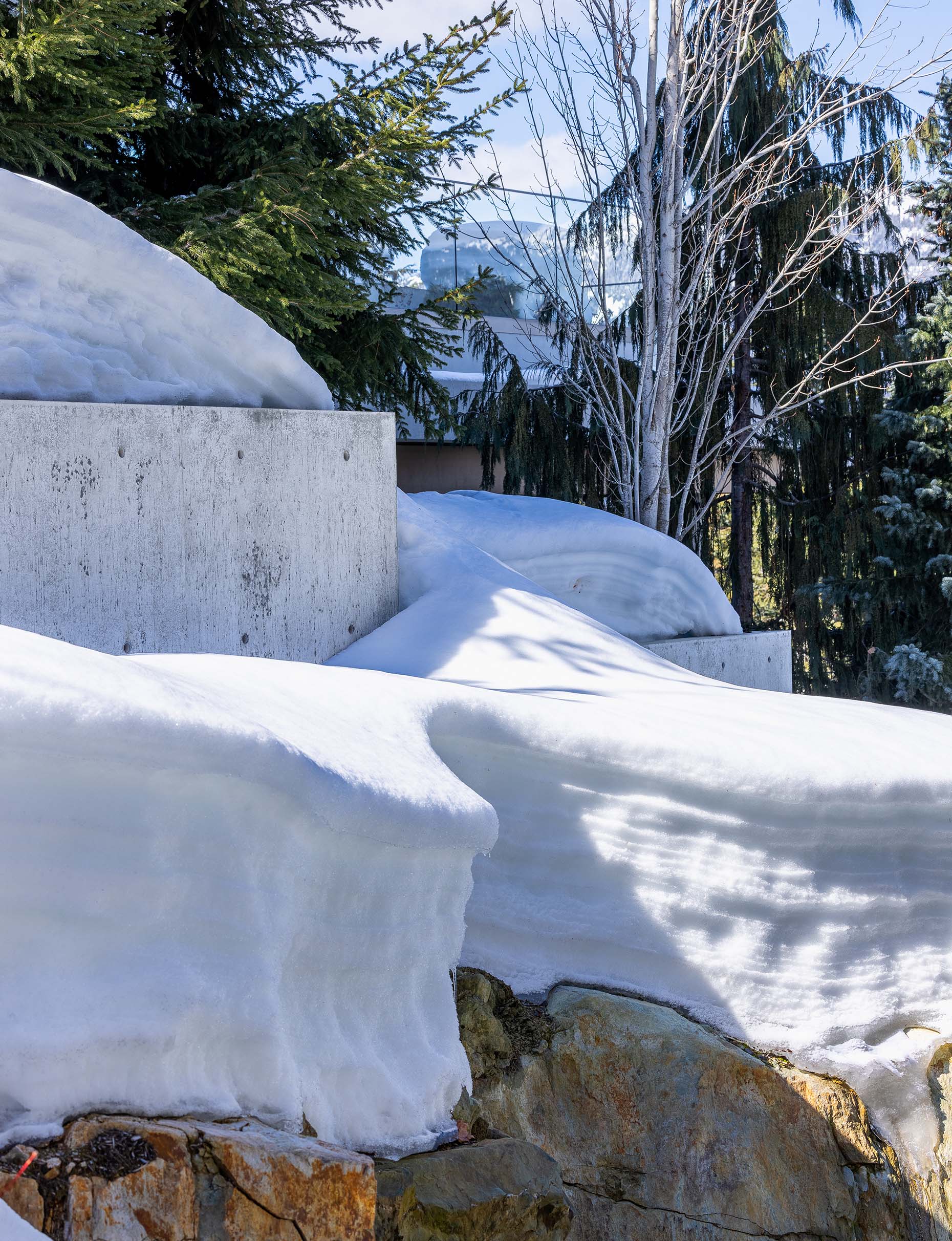 Designed as a grand Bavarian-style chalet rising from the alpine forest, the significant grade change of this site provides opportunities for an uncommon landscape. Of special importance to the design influenced by the Brutalist movement, the irregularly-placed concrete fin walls provide a modern ambiance; yet also provide protection from sloughing, run-off, and snow slides. The protected pockets they create are planted with native species that will provide the home with privacy, and a forested atmosphere to appreciate from the spa on a snowy winter’s day. In the summer season, an undulating field of salvia varieties cascade along with native conifers and soft ferns.