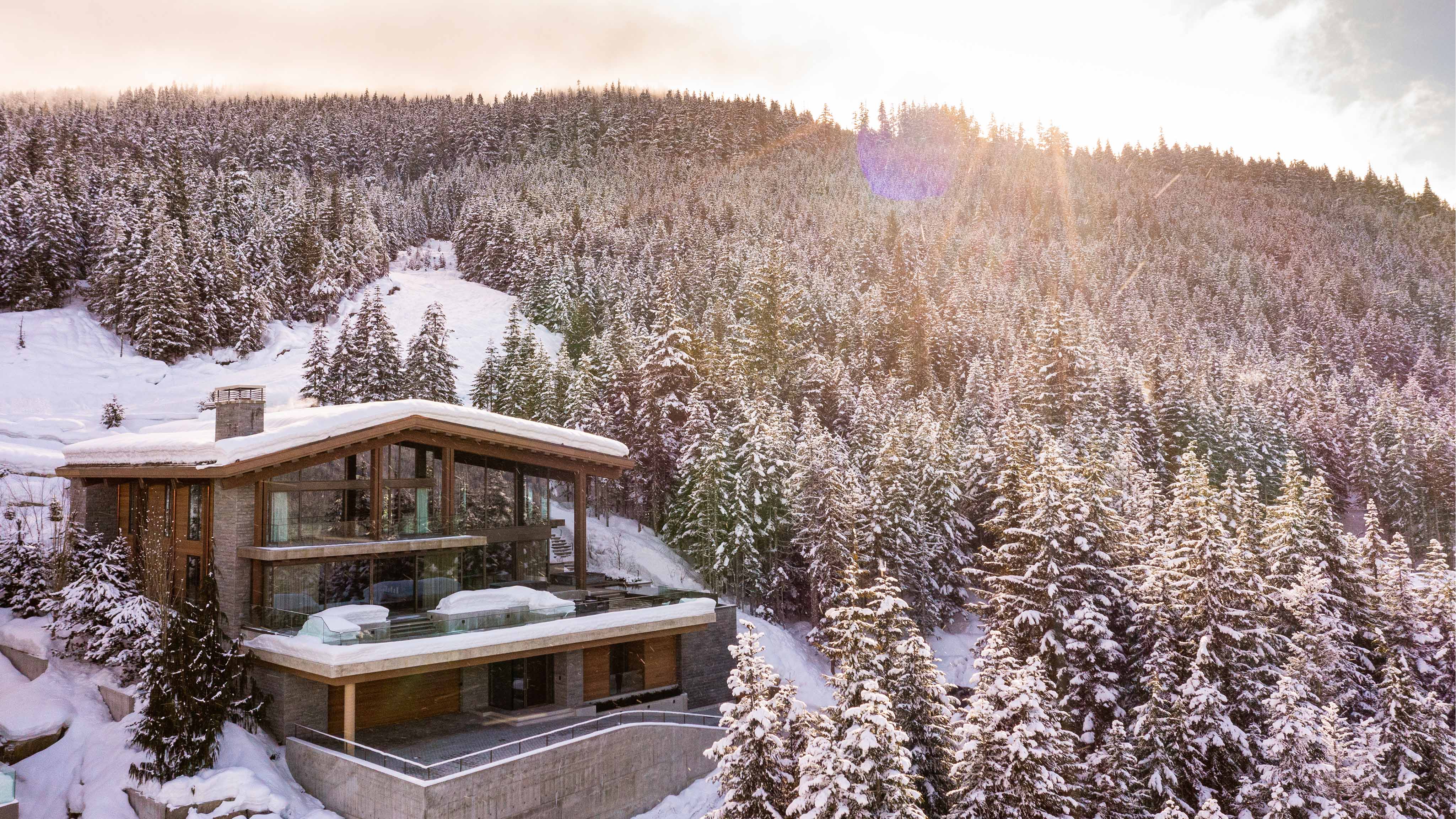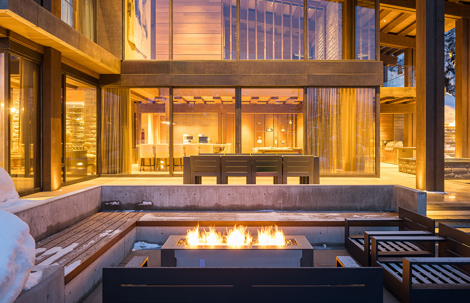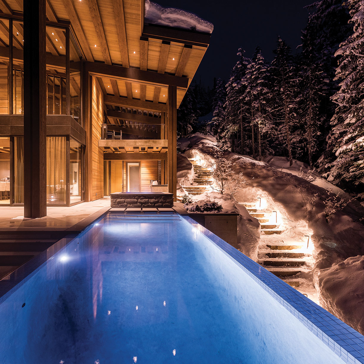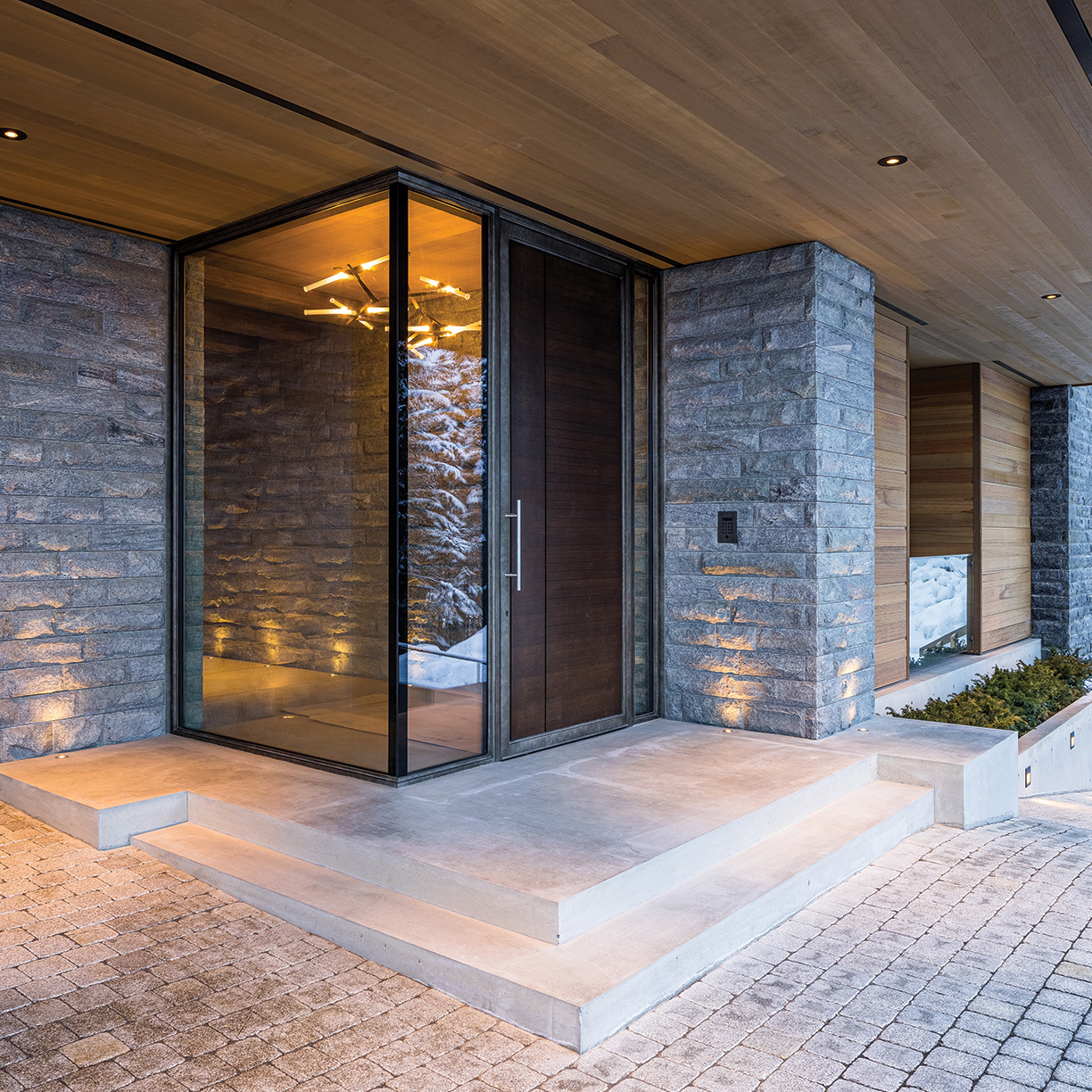 Designed as a grand Bavarian-style chalet rising from the alpine forest, the significant grade change of this site provides opportunities for an uncommon landscape. Of special importance to the design influenced by the Brutalist movement, the irregularly-placed concrete fin walls provide a modern ambiance; yet also provide protection from sloughing, run-off, and snow slides. The protected pockets they create are planted with native species that will provide the home with privacy, and a forested atmosphere to appreciate from the spa on a snowy winter’s day. In the summer season, an undulating field of salvia varieties cascade along with native conifers and soft ferns.