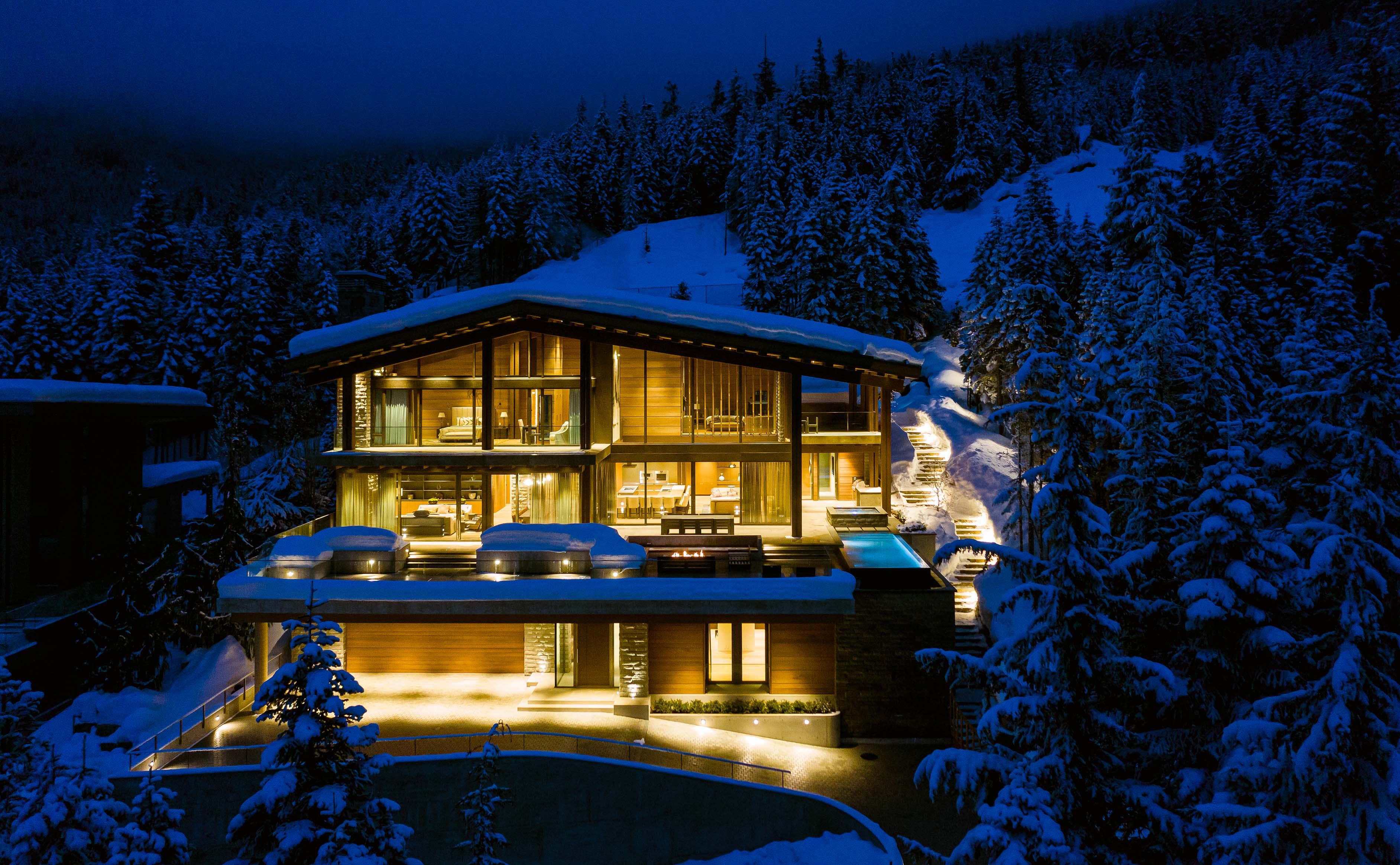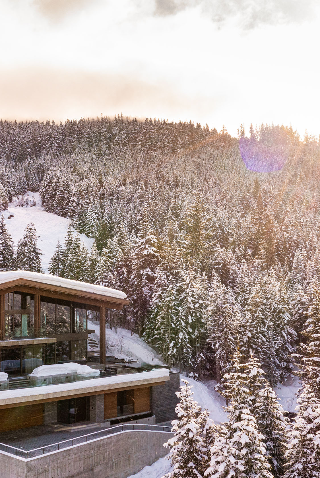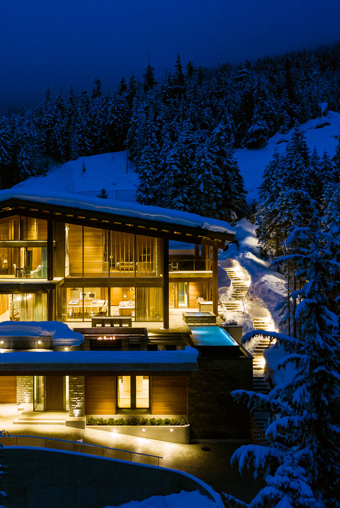 Designed as a grand Bavarian-style chalet rising from the alpine forest, the significant grade change of this site provides opportunities for an uncommon landscape. Of special importance to the design influenced by the Brutalist movement, the irregularly-placed concrete fin walls provide a modern ambiance; yet also provide protection from sloughing, run-off, and snow slides. The protected pockets they create are planted with native species that will provide the home with privacy, and a forested atmosphere to appreciate from the spa on a snowy winter’s day. In the summer season, an undulating field of salvia varieties cascade along with native conifers and soft ferns.