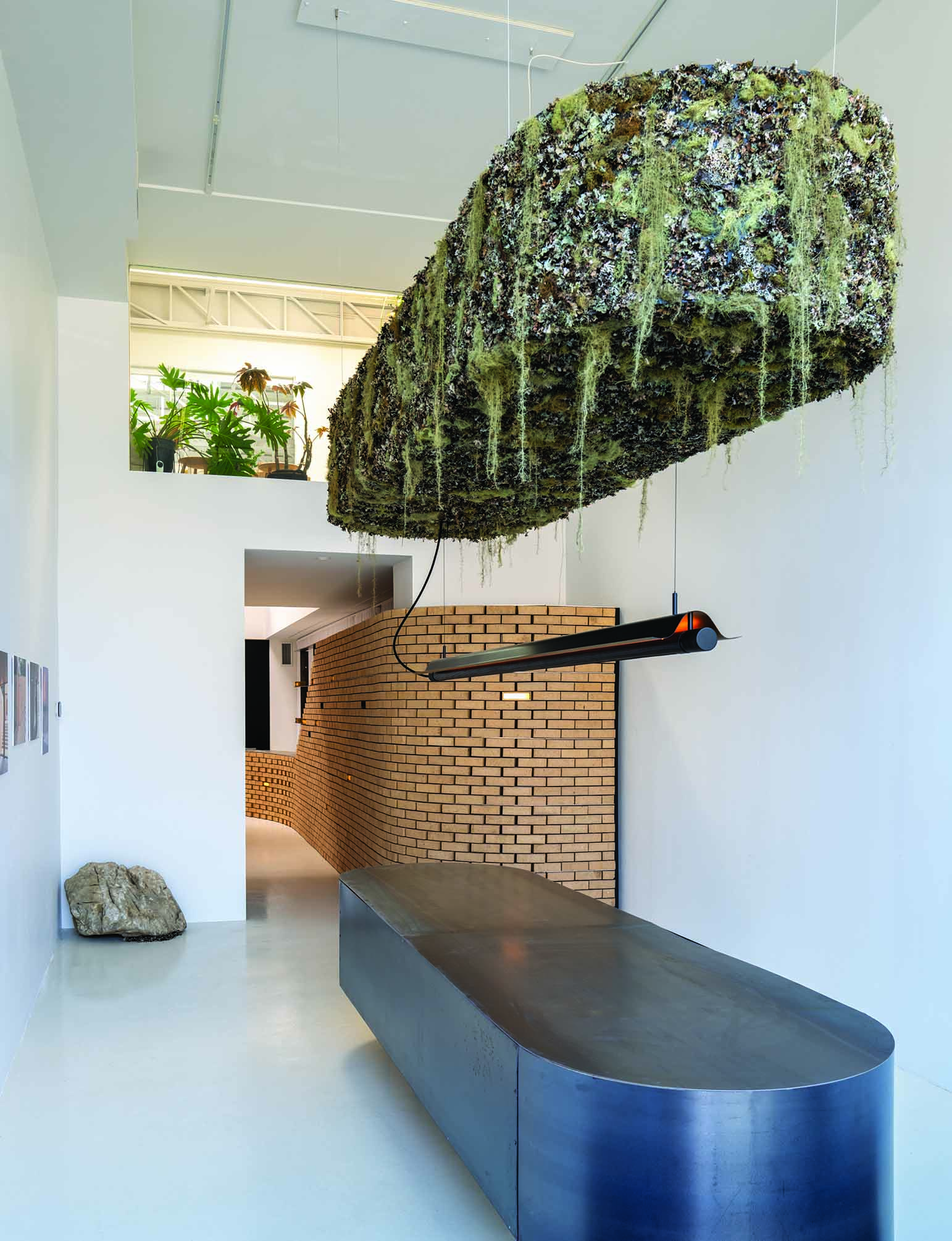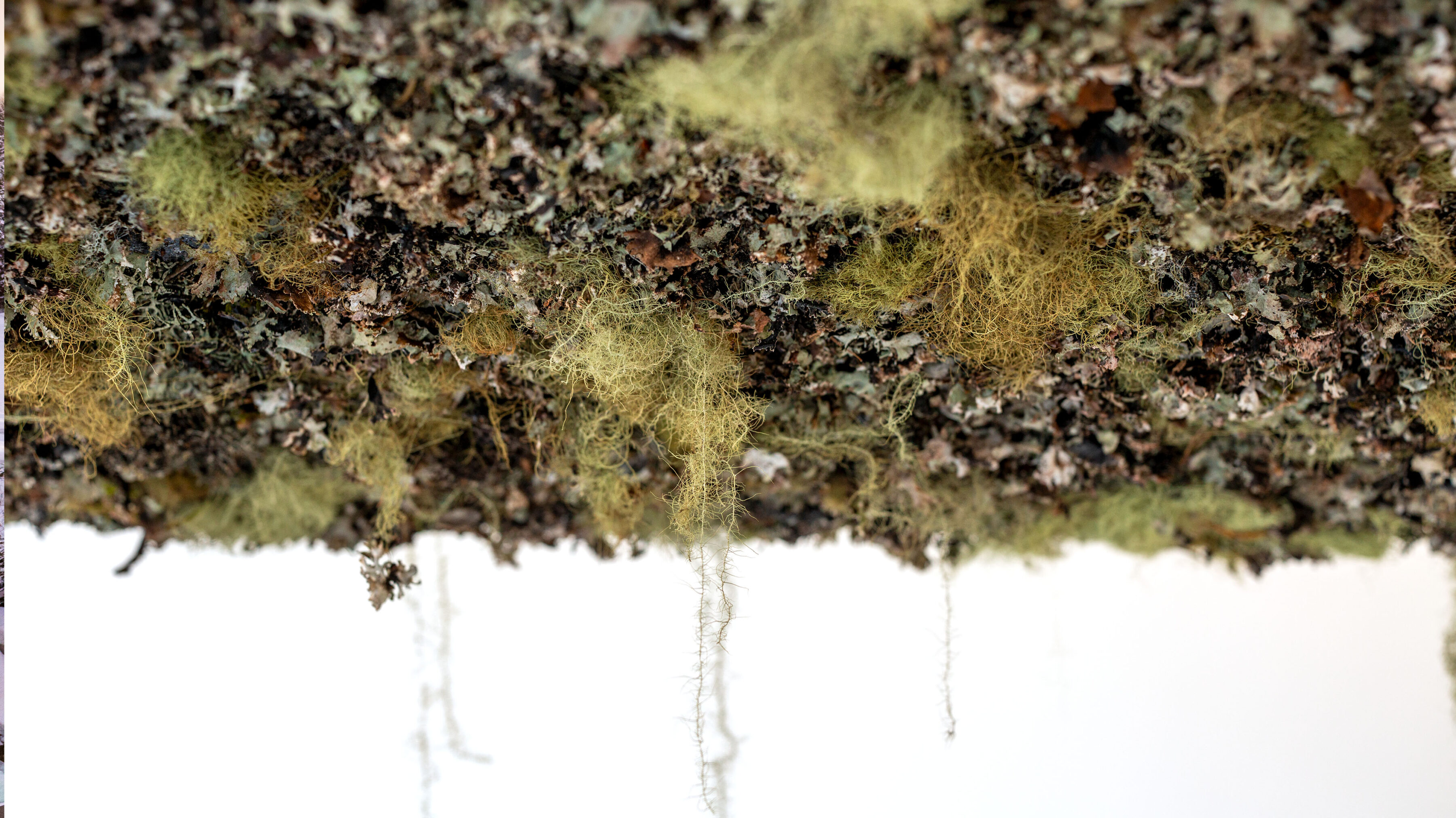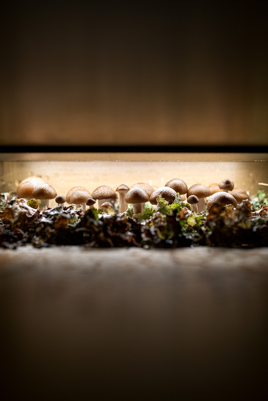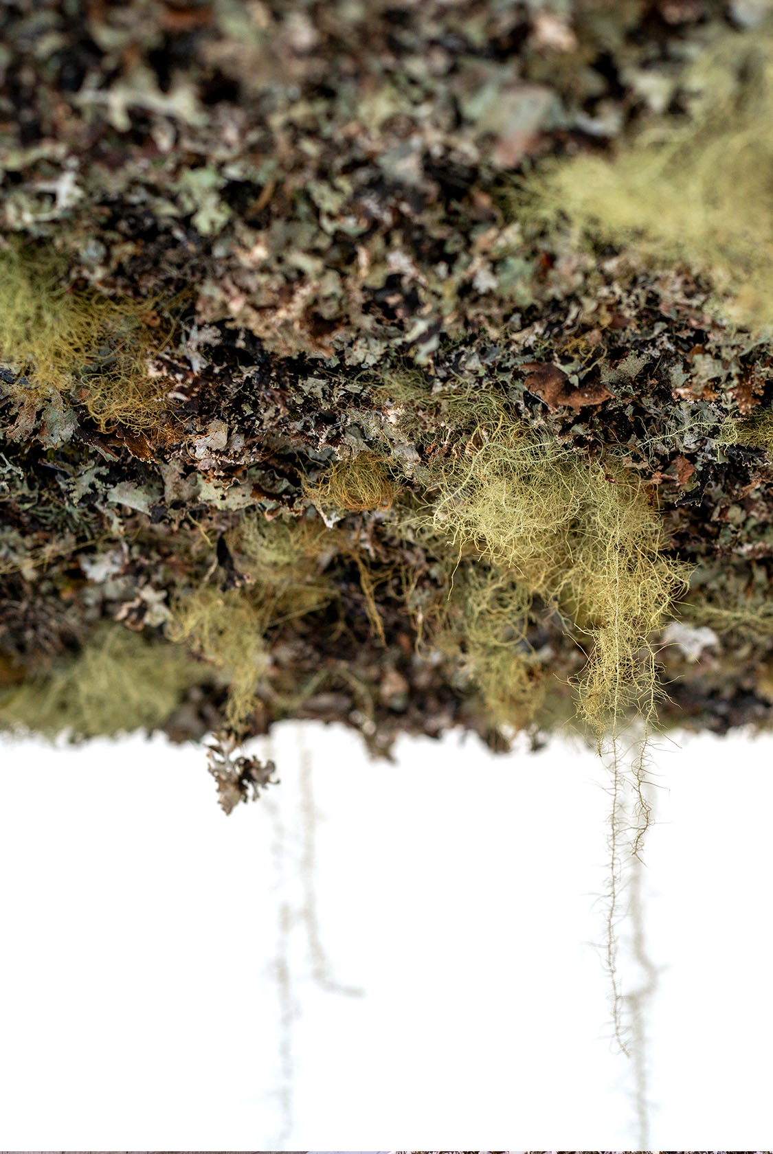 The completed installation in Mason Studio, Toronto was designed in reference to the Halifax home of Omar Gandhi, highlighting the adaptability of their new lighting designs. Donohoe’s contribution was to incorporate materials from the natural world that would create a balance with the manufactured products. These materials comprised of three distinct elements. First, large boulders were sourced locally, then cut and intentionally placed throughout the space to ground the installation. Then, foliose lichen (Hypogymnia physodes) – sustainably gathered from forests on the West Coast – covers structures that mirror the table in the space. This subtly softens the hardscape and gives the installation an established appearance, all the while putting focus on the lighting products. Finally, the miniature fungi terrarium gardens are a delightful surprise for those who take the time to immerse themselves in the experience.