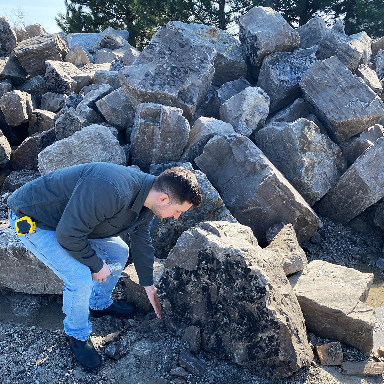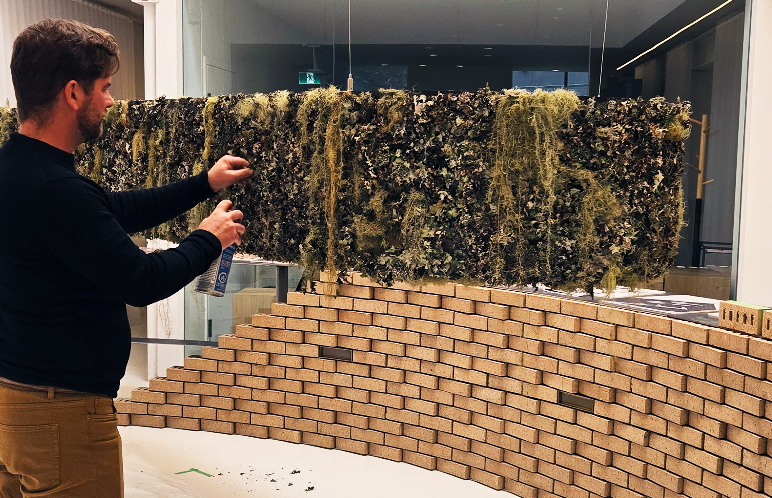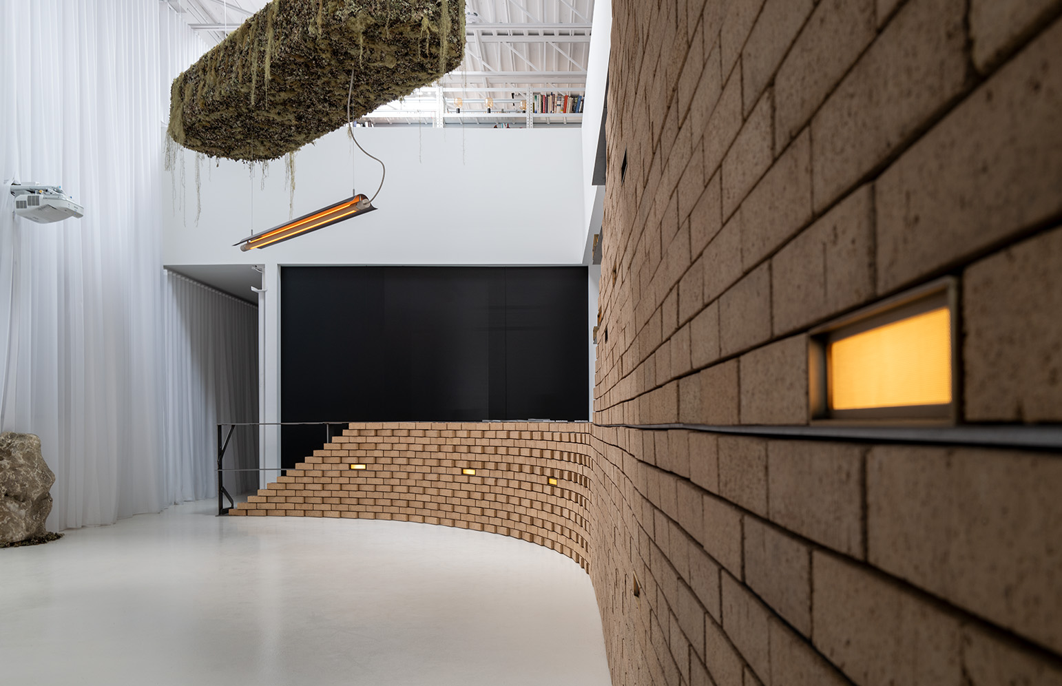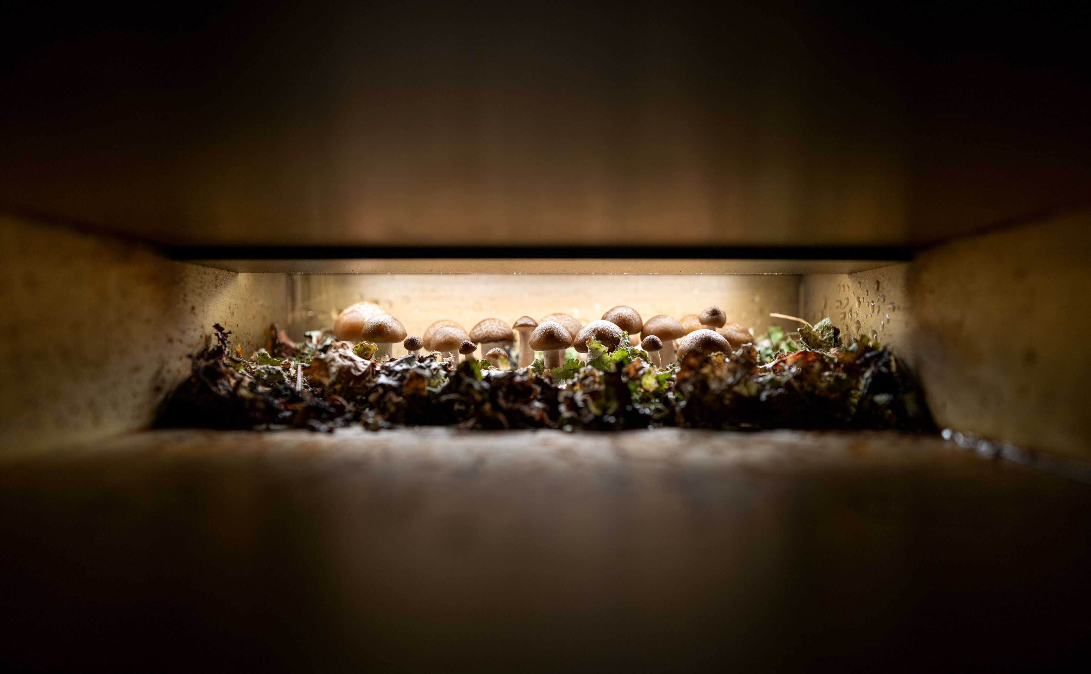 The completed installation in Mason Studio, Toronto was designed in reference to the Halifax home of Omar Gandhi, highlighting the adaptability of their new lighting designs. Donohoe’s contribution was to incorporate materials from the natural world that would create a balance with the manufactured products. These materials comprised of three distinct elements. First, large boulders were sourced locally, then cut and intentionally placed throughout the space to ground the installation. Then, foliose lichen (Hypogymnia physodes) – sustainably gathered from forests on the West Coast – covers structures that mirror the table in the space. This subtly softens the hardscape and gives the installation an established appearance, all the while putting focus on the lighting products. Finally, the miniature fungi terrarium gardens are a delightful surprise for those who take the time to immerse themselves in the experience.