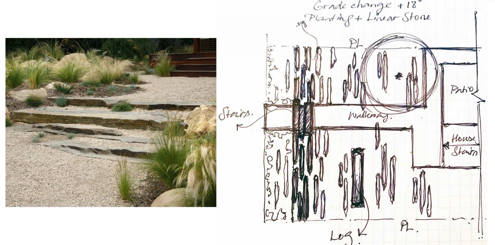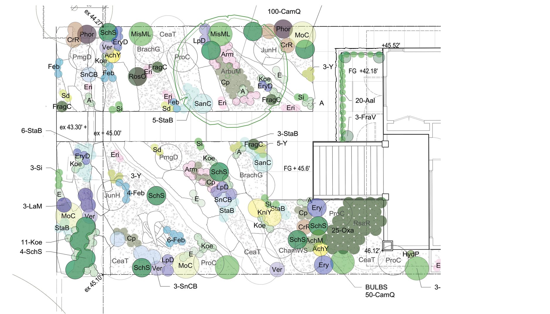 Layered rock forms and the juxtaposition between geometric and organic shapes were the catalysts for this sustainably-designed landscape. Directly adjacent to the iconic Kitsilano beach, the front of the property is designed to be integrated into the larger coastal environment, while the rear of the property is reminiscent of the local temperate rainforest. Sustainably-focused designs were incorporated throughout the site, specifically in the green-roofed garage planted with pollinator species, stormwater retention strategies, and exclusively arid plantings throughout the site.